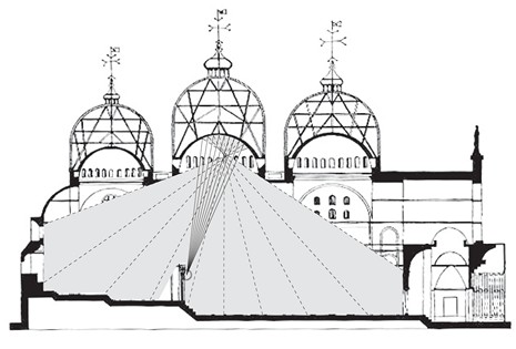 The effect of the plan and walls must always be considered in conjunction with the ceiling. When the height of a space is the same or less than the radius of the dome crowning it, the sound will be concentrated by the dome; in all other cases, the dome reflects sound out into the congregation below.