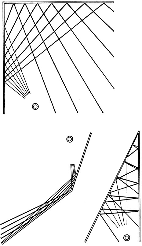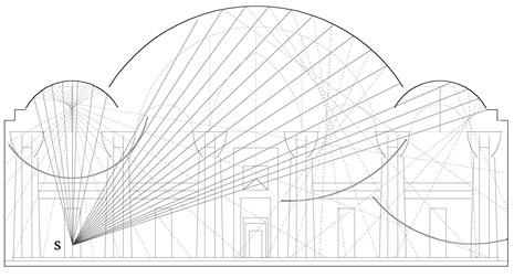 Computer programmes use three-dimensional ray tracing to calculate the geometric propagation of sound. Such calculations are valid only for a particular combination of the position of the sound source and the listener. With an appropriately chosen cross section, two-dimensional geometric analyses can provide general information about the dissipation of sound taking into account higher order reflections from two, three or more surfaces. Although the attenuation of sound energy is not directly visible, such geometric analyses can provide useful information for the planning of the form of the space. Acute angles and niches lead to localised sound accumulation, which can be intrusive if that is where listeners are located, or if they lead to the delayed relaying of sound to the listener. Right angles and rectangular spaces provide the most even distribution of sound. As with mirrors, concave surfaces (such as the inward curve of a wall or a barrel vault), concentrate sound in a focal point, whereas sound reflecting off convex surfaces is dispersed. Depending on the distance between the sound source and the reflective surface, the effect of a surface can change entirely.