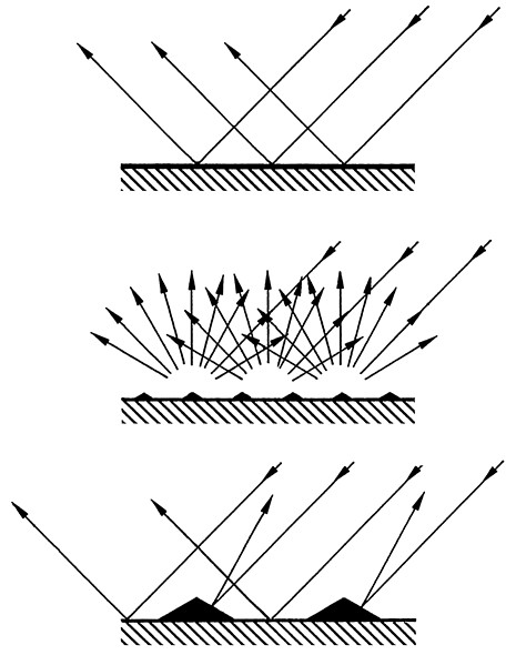 Reflections of different frequencies on a scattering structure: for low frequencies the surface reflects as if it were smooth, for medium frequencies it scatters diffusely, for high frequencies it acts like many small reflectors oriented in different directions Source: Thomas Baer-Loy