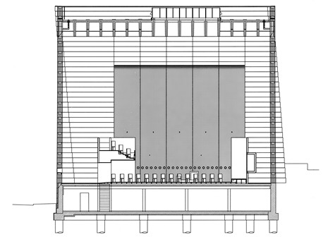 It is important that undesirable acoustic effects do not occur in the outer 26 by 24 by 24 metre cuboid form. The rotational torsion of the walls avoids such effects. Each course of blockwork is rotated slightly so that in all from top to bottom the walls are inclined by 5 degrees. The resulting twist and the surface structure of the opposite walls avoids the creation of flutter echo and standing waves, and dissipates high frequency sound waves. Likewise, the coffered concrete ceiling eliminates reverberations that are too hard.